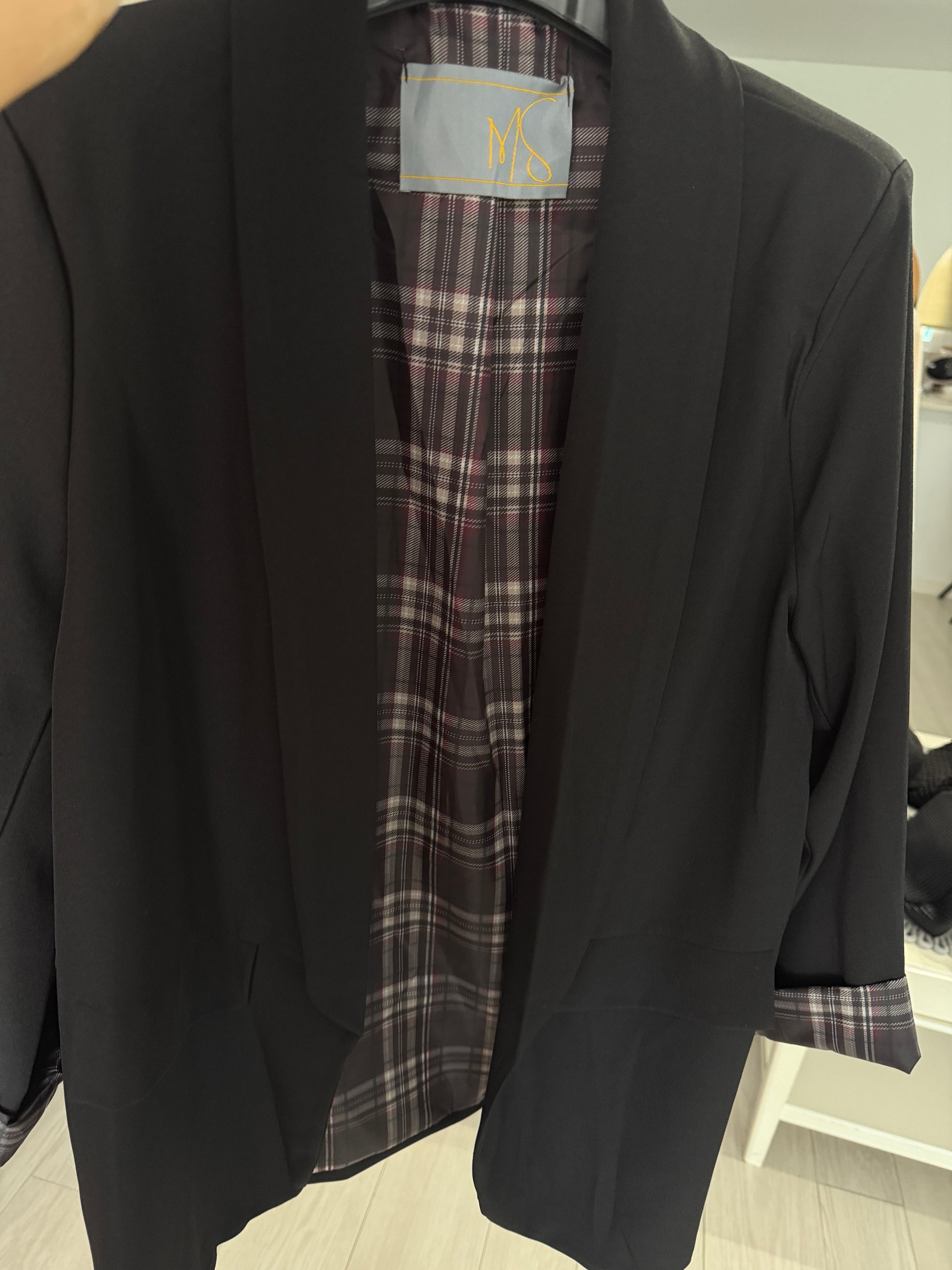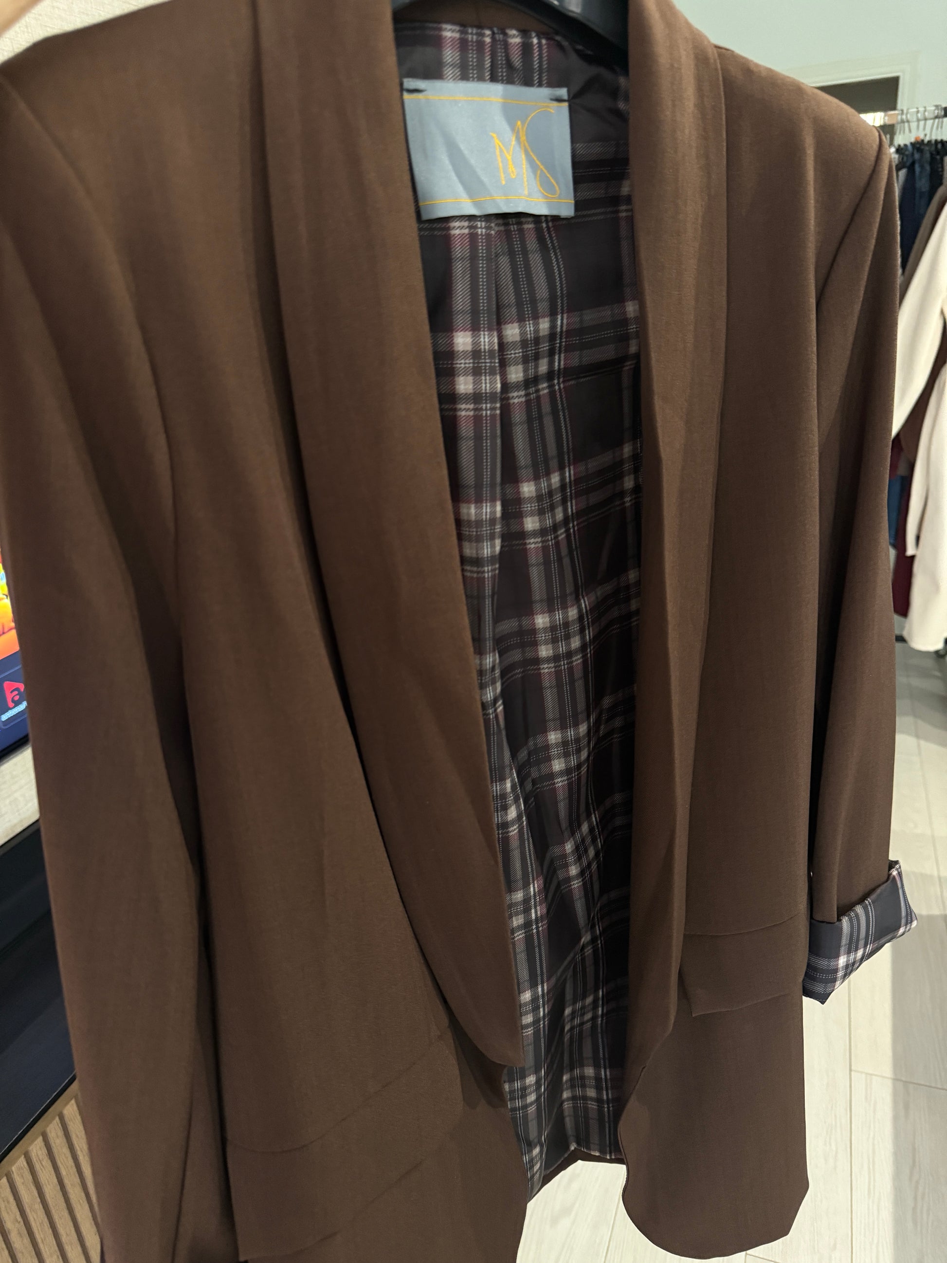 Americana elegante con forro de cuadros Vichy, visible al doblar la manga. Perfecta para llevar sobre jeans y camiseta para un look casual chic, o con pantalón de vestir para un toque moderno y sofisticado.