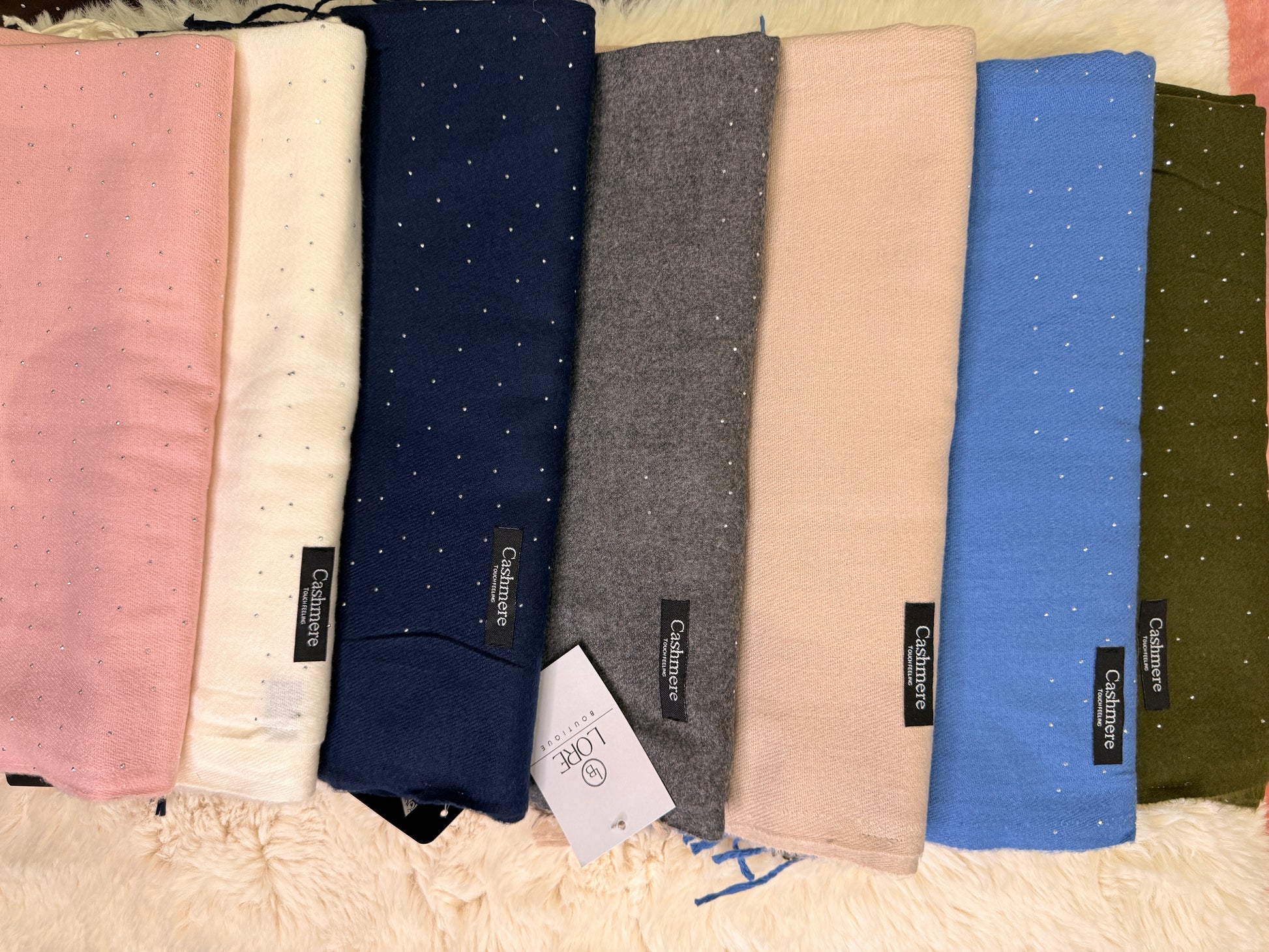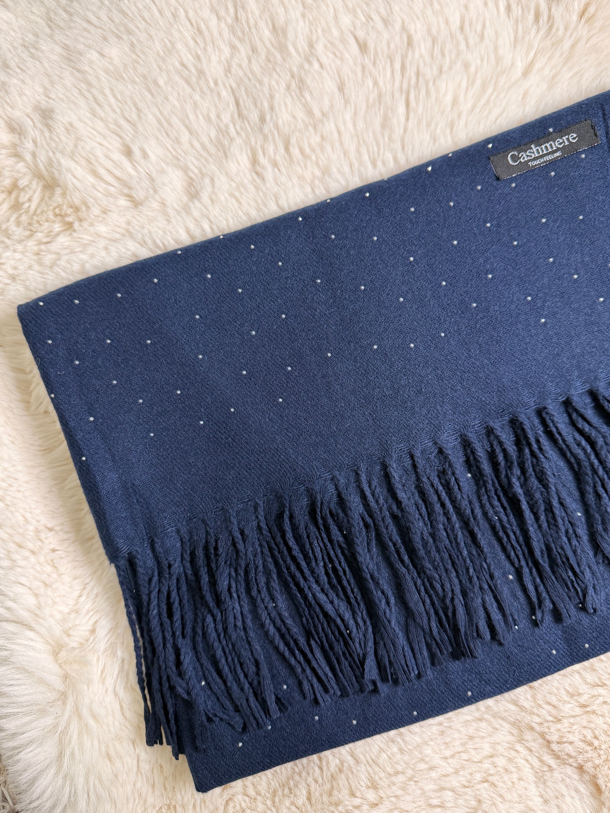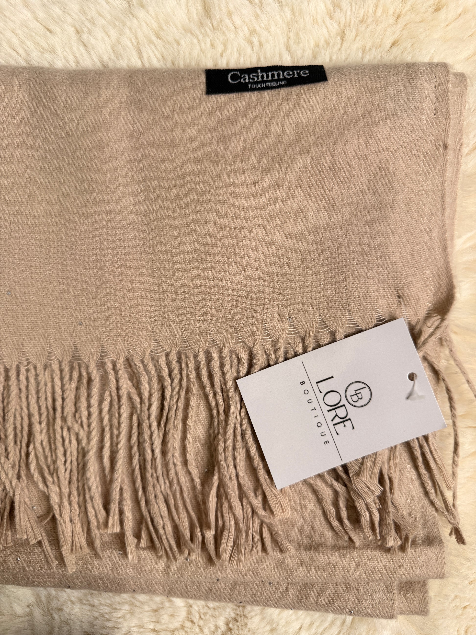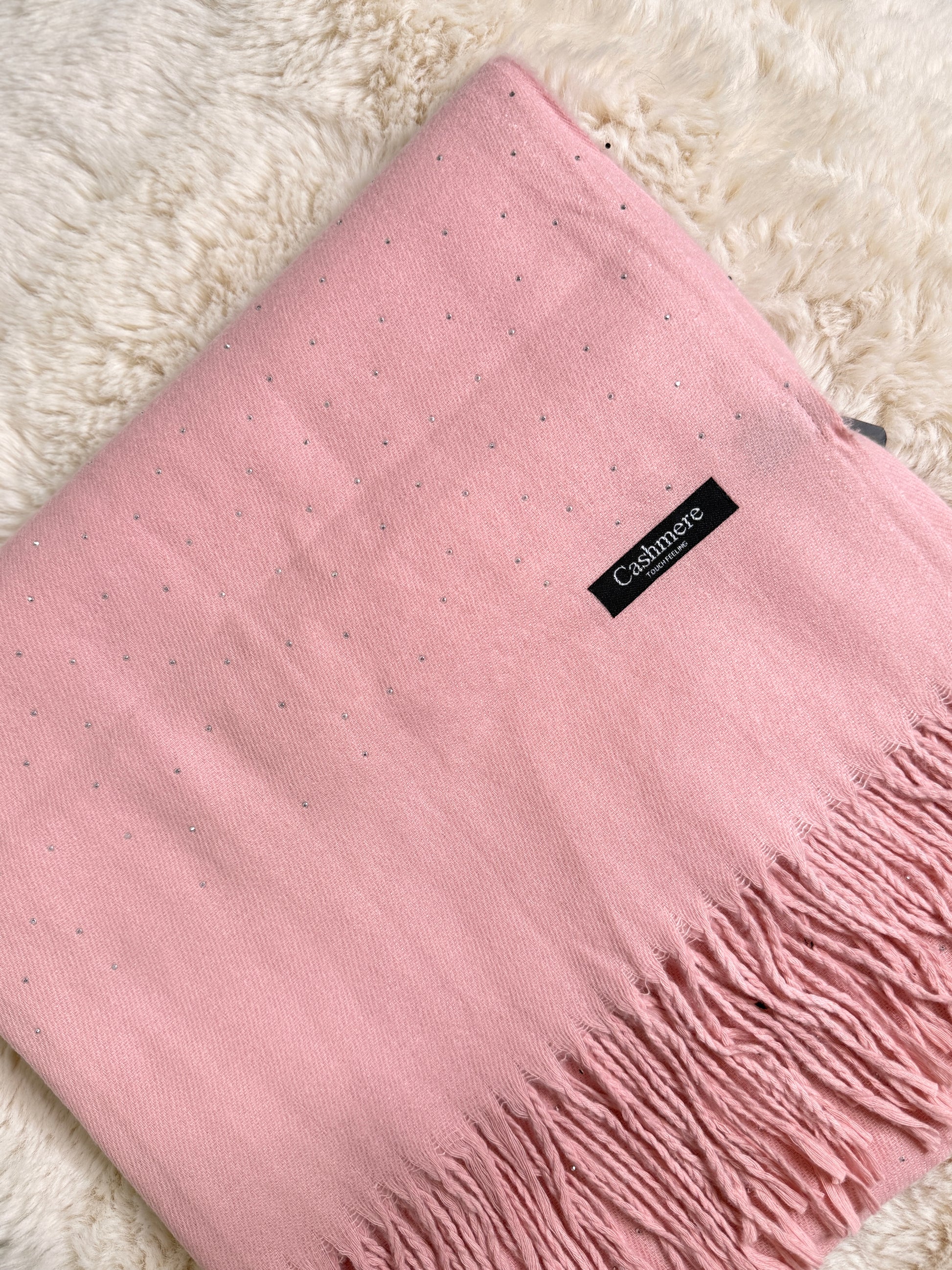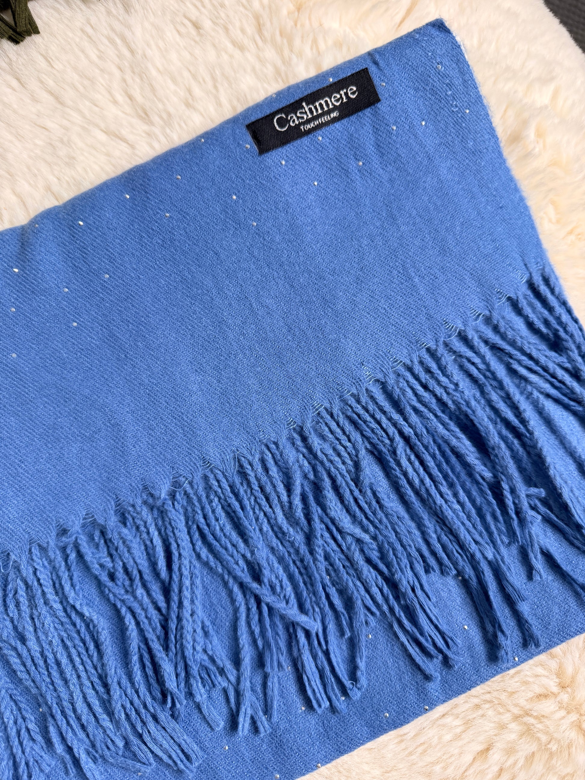 Una bufanda muy suave, con tacto de cashmere,acabados en flecos, con cristales pequeños y delicados, en colores preciosos