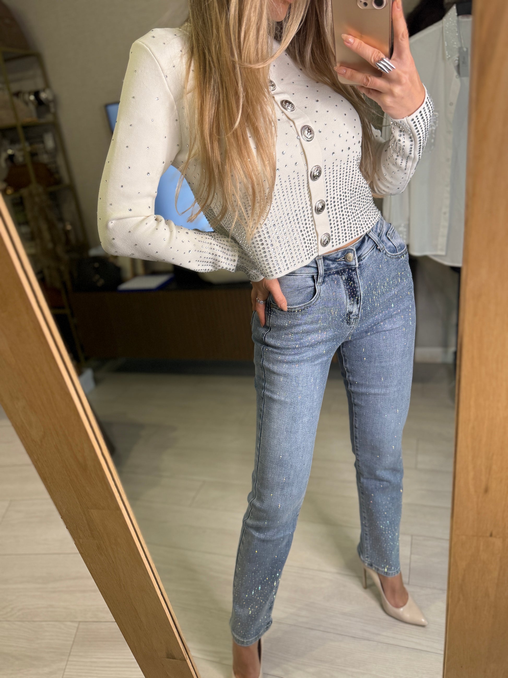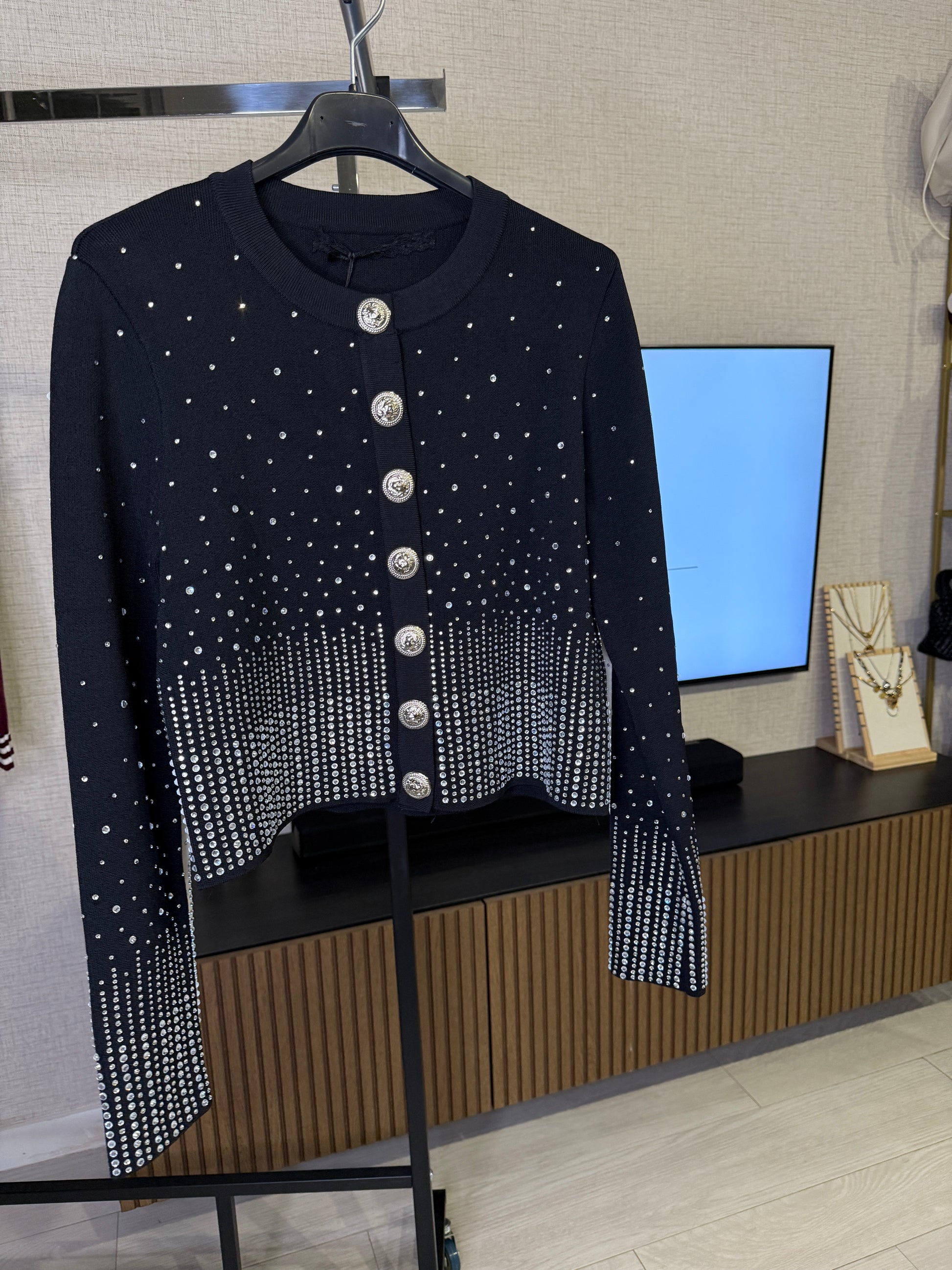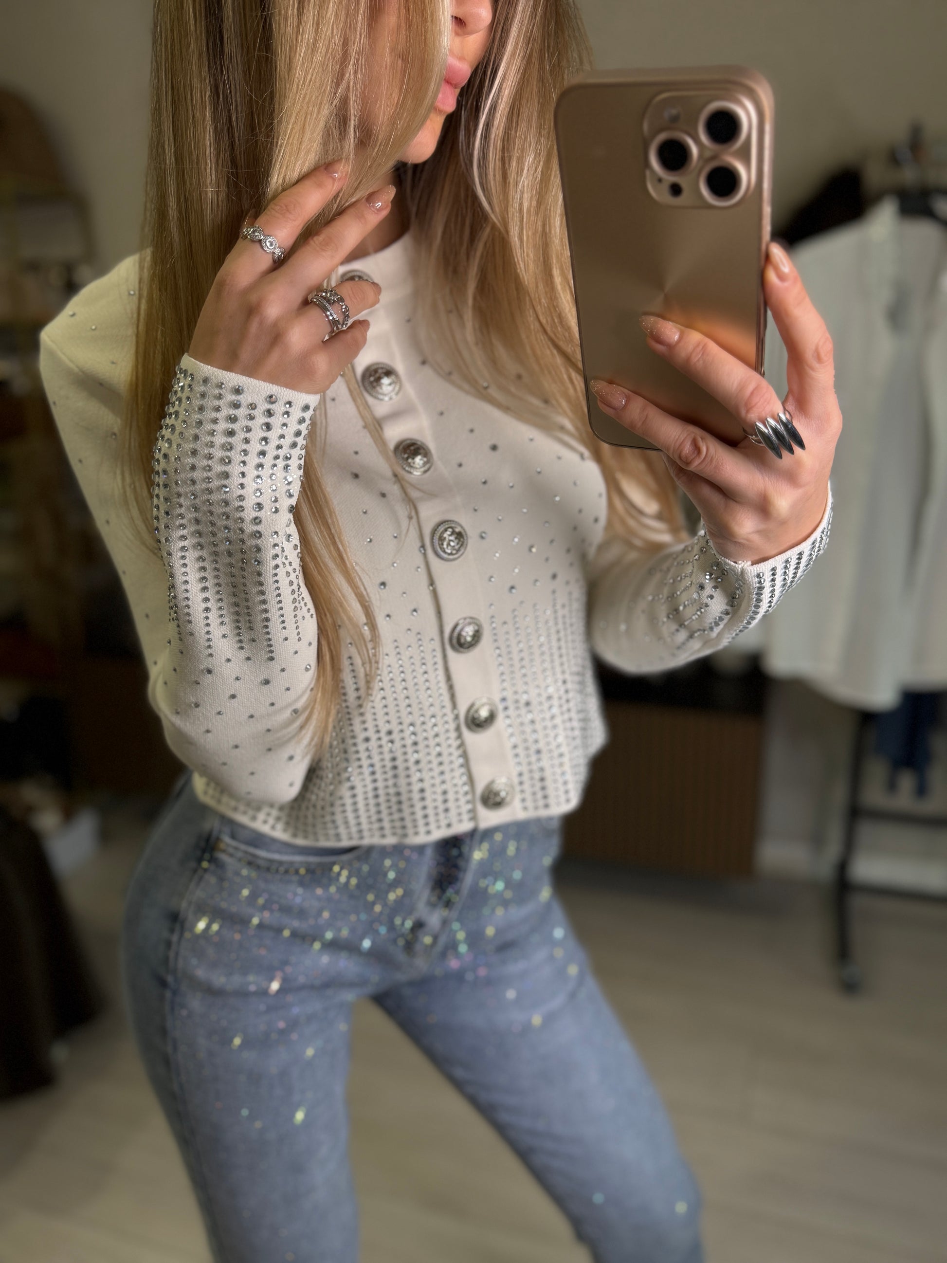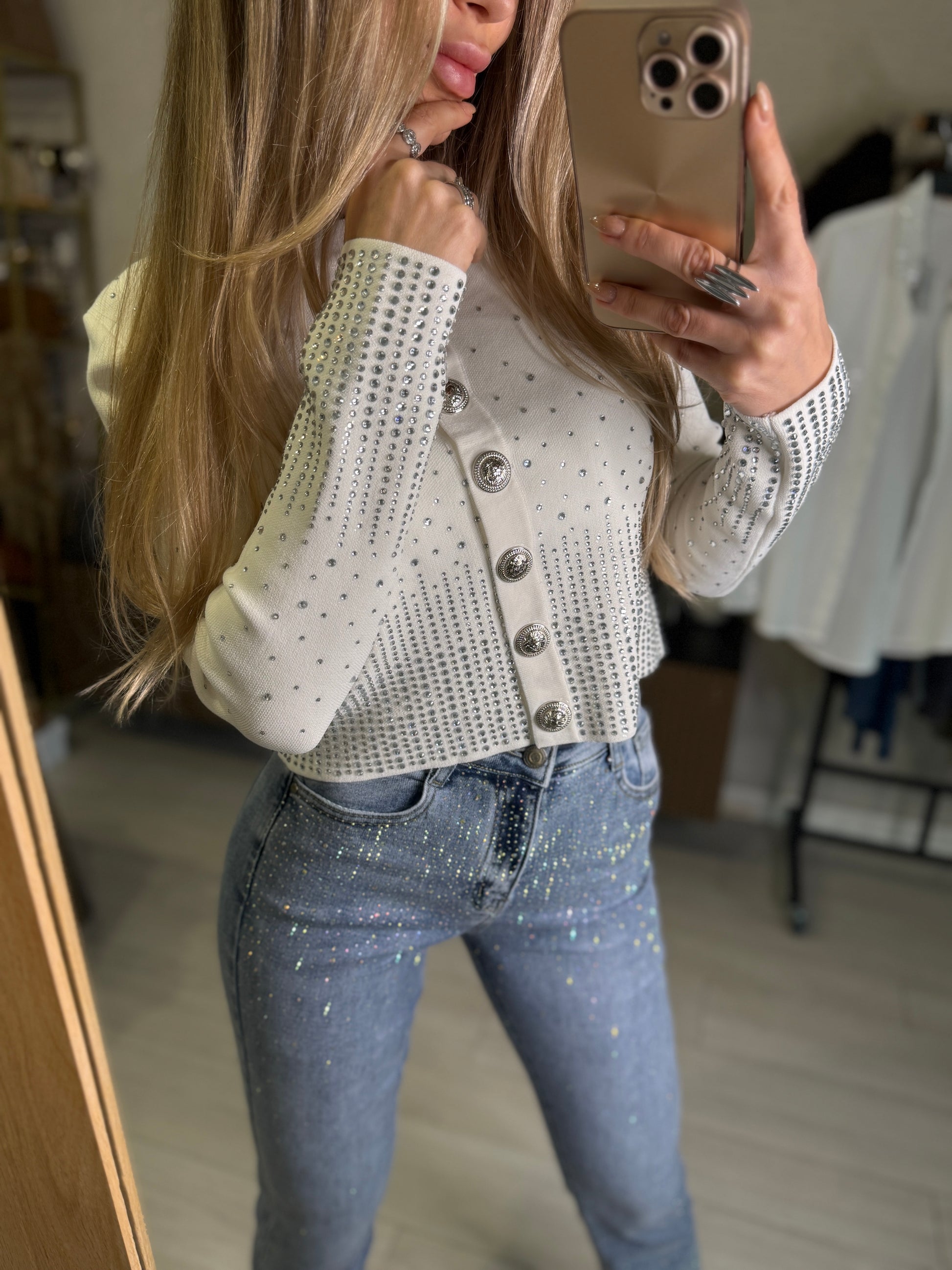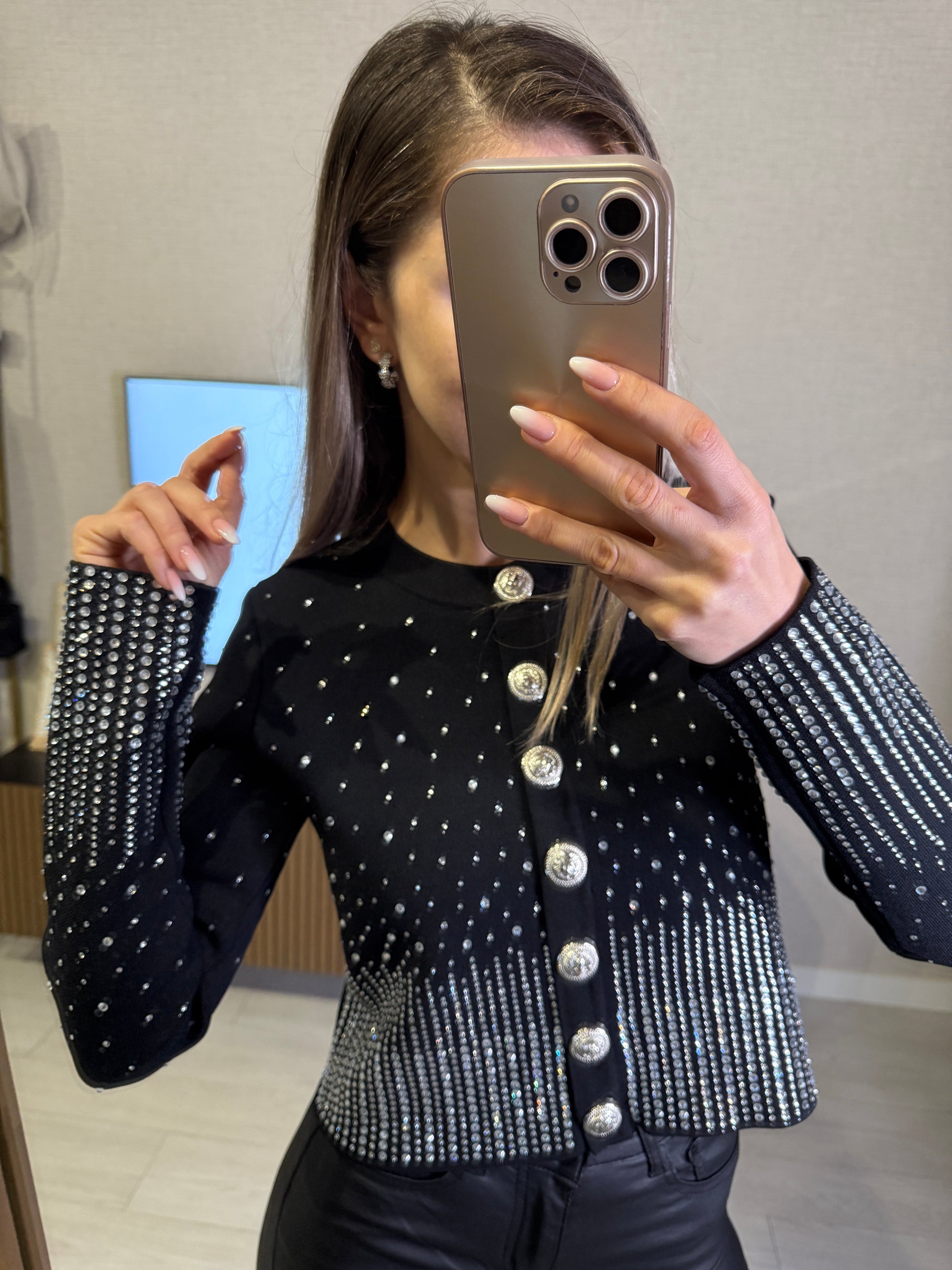 Nuestro nuevo cardigan lleno de brillo es la prenda perfecta para deslumbrar en cualquier ocasión. Con botones tipo joya y detalles que recuerdan a diamantes, aporta un toque elegante y sofisticado a tu look. Disponible en blanco y negro, es ideal para fiestas, eventos o cualquier momento en el que quieras brillar con estilo.