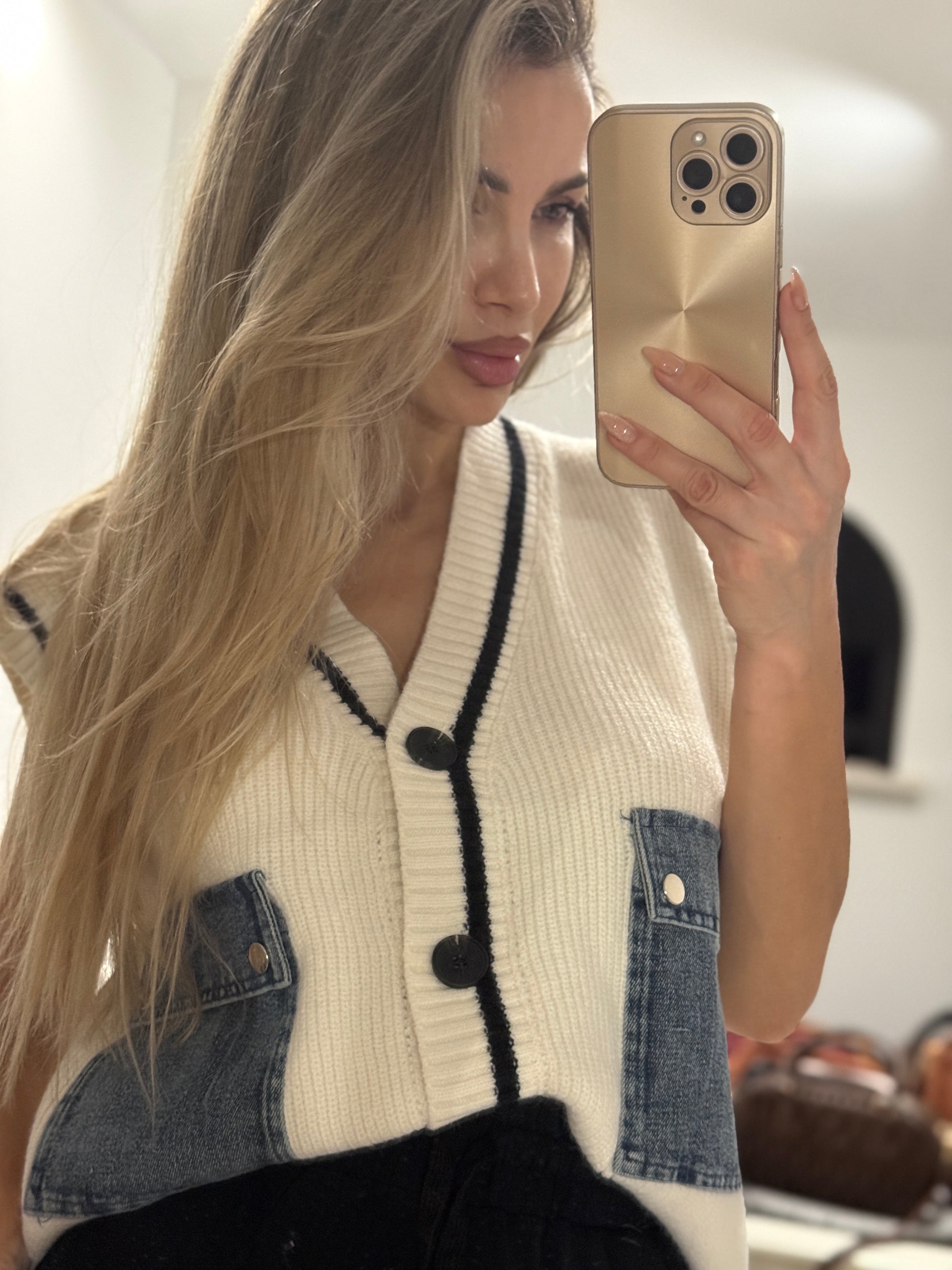Chaleco de punto con bolsillos en denim, talla única, ideal desde una XS hasta una XL.