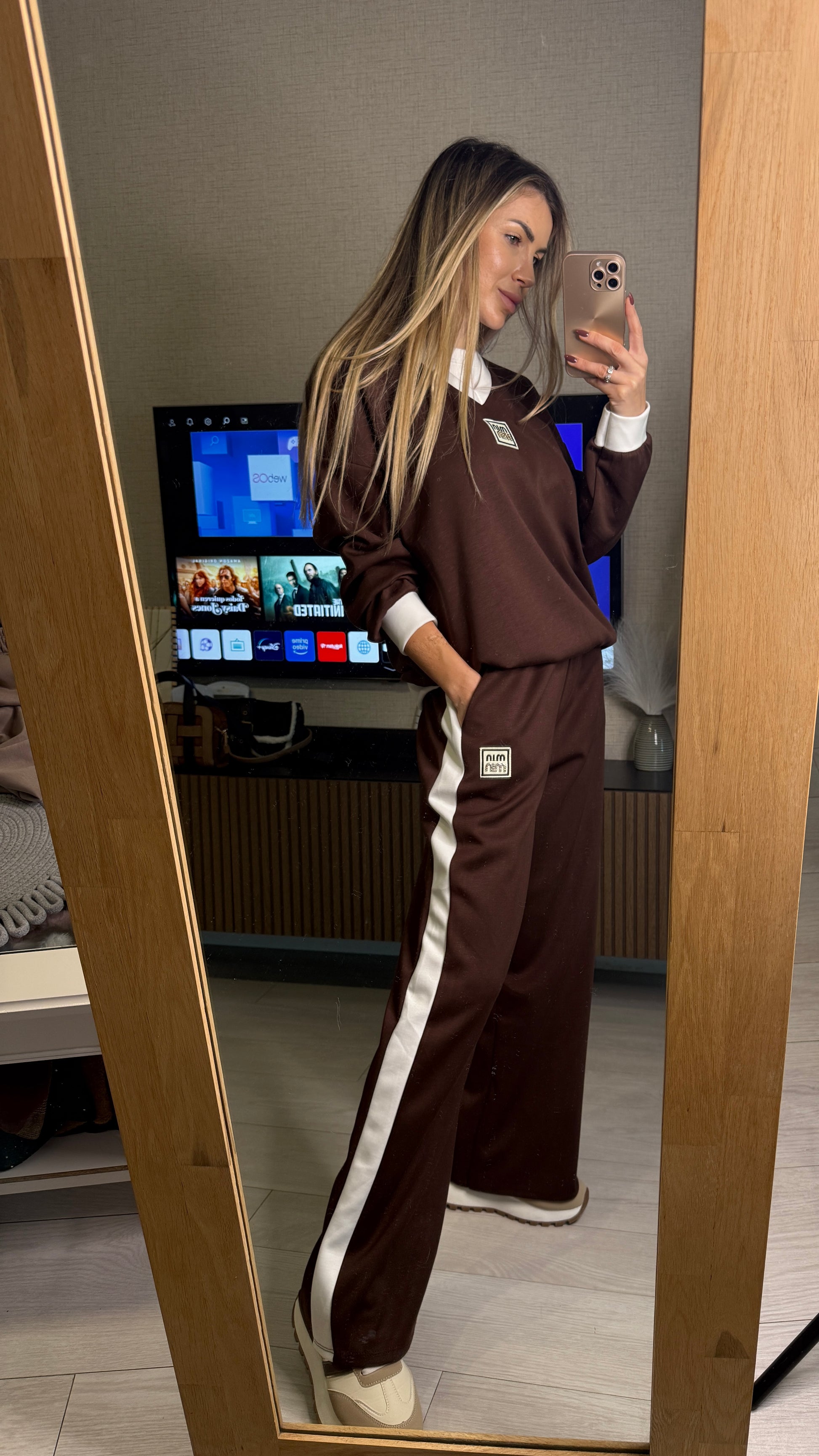 Conjunto tipo chándal en marrón chocolate con detalles blancos que le dan un toque súper elegante. Sudadera cómoda y pantalón de tiro recto con cintura elástica. Talla única, adaptable desde XS hasta XL.