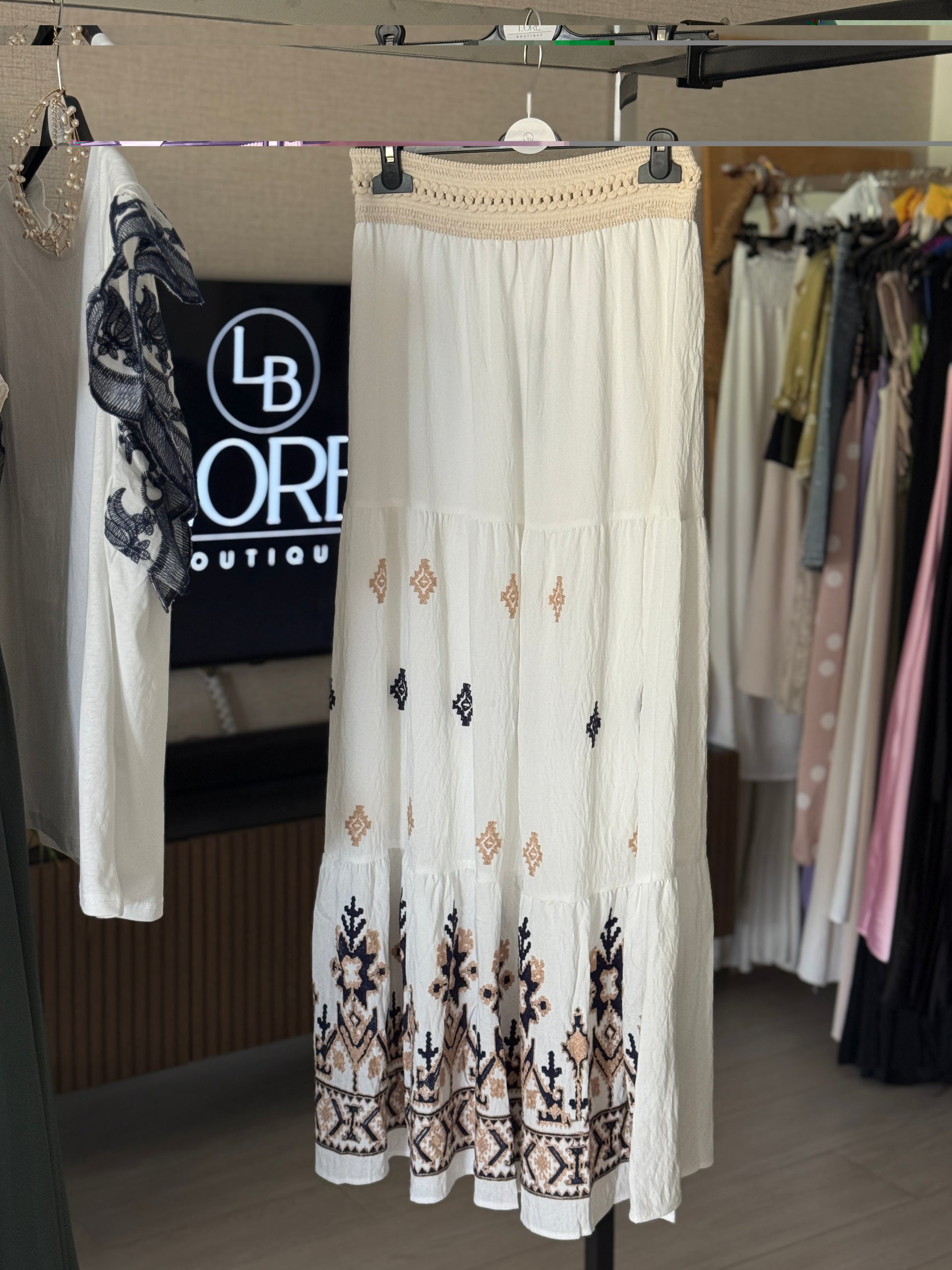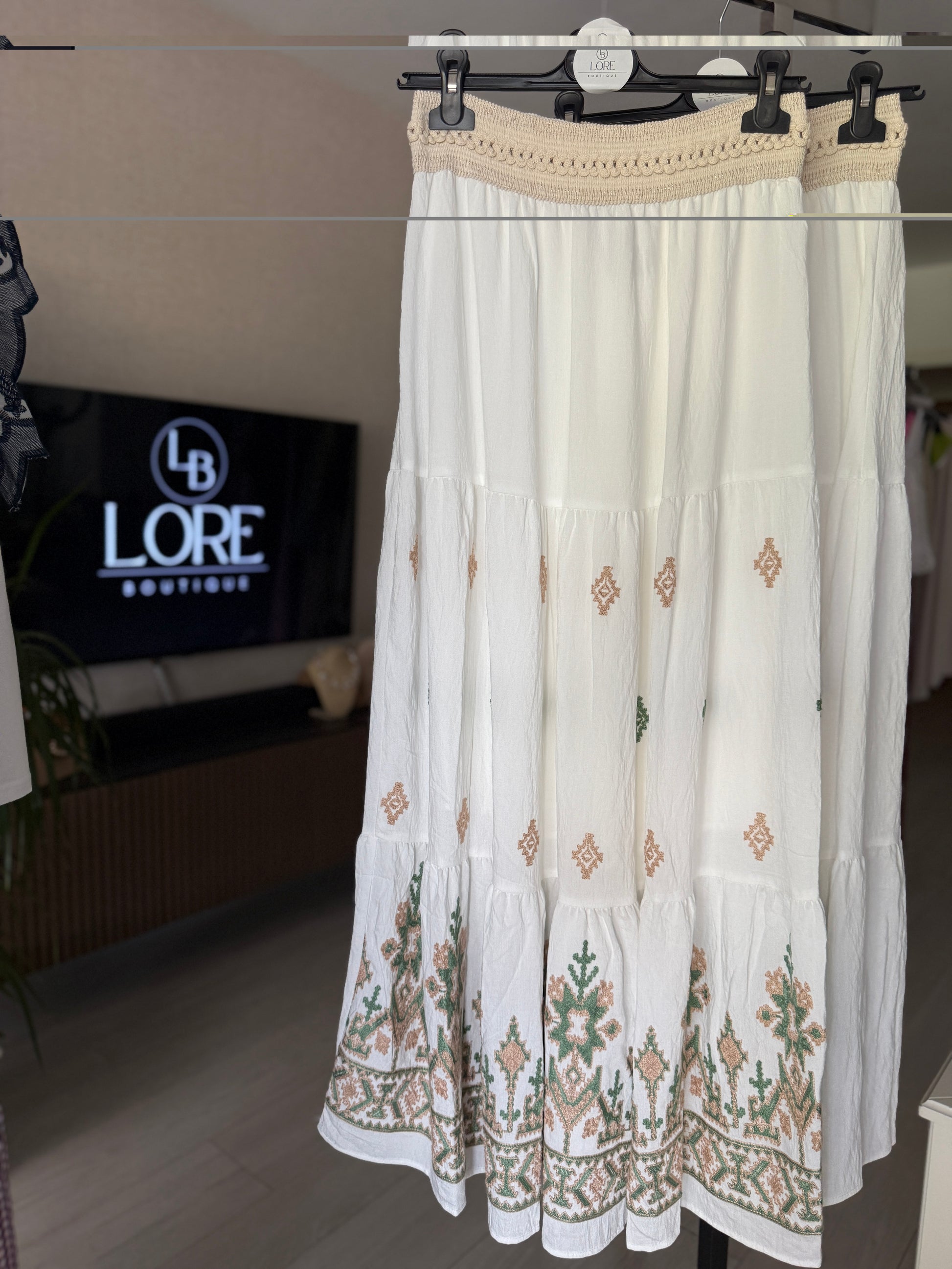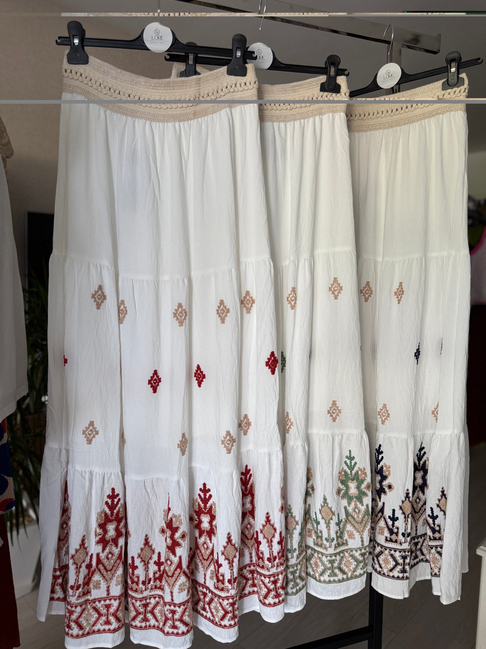 Añade un toque de frescura y estilo a tu look veraniego con esta falda bohemia en color blanco, diseñada con hermosos bordados en tonos vibrantes. La cintura elástica con detalle de crochet asegura un ajuste cómodo y favorecedor. Los bordados, que se encuentran en la parte inferior de la falda, presentan una variedad de colores, como rojo, verde y azul, lo que le da un toque único y lleno de personalidad. Perfecta para combinar con una blusa ligera o un top bohemio, esta falda es ideal para cualquier ocasión veraniega.