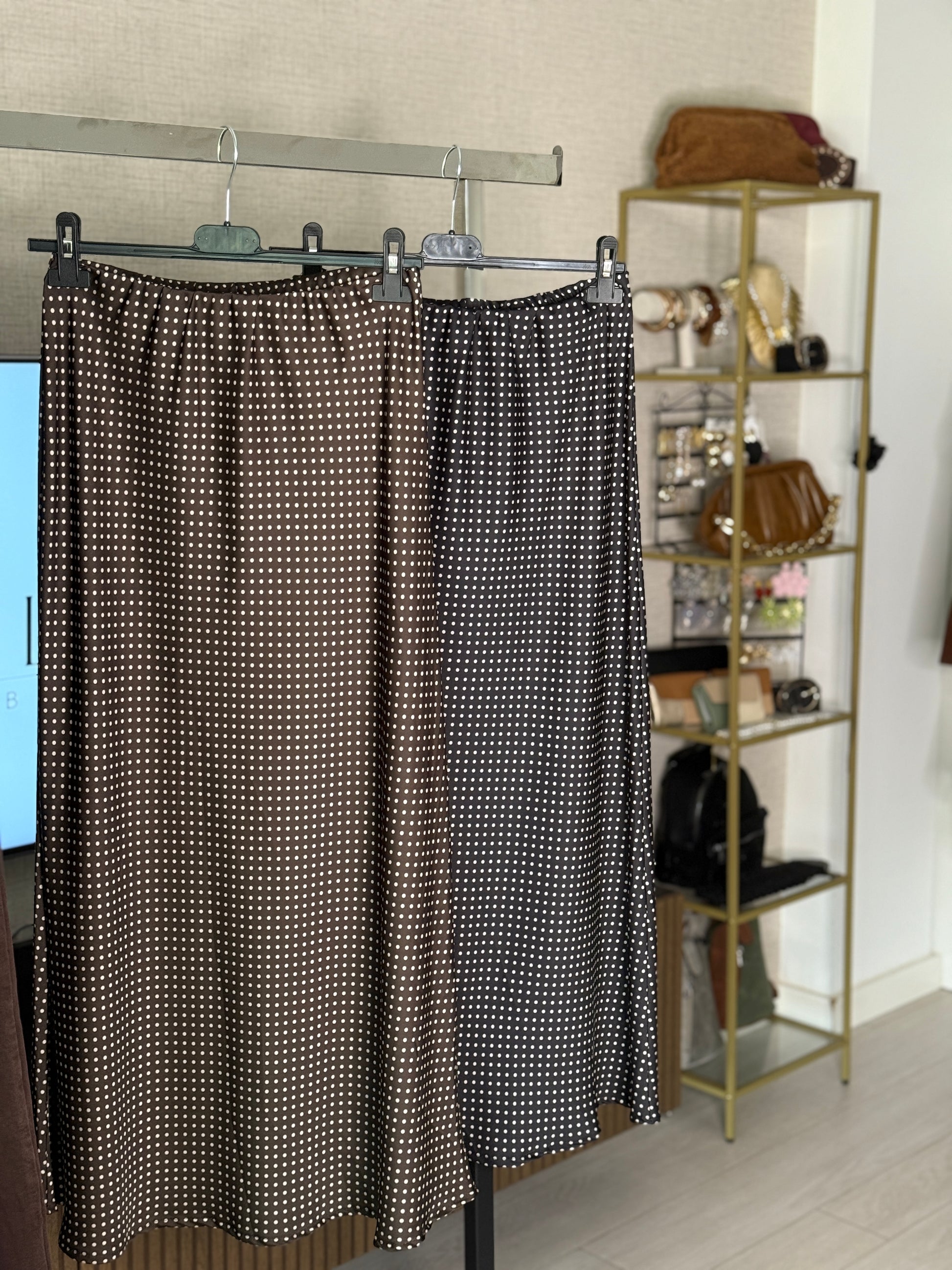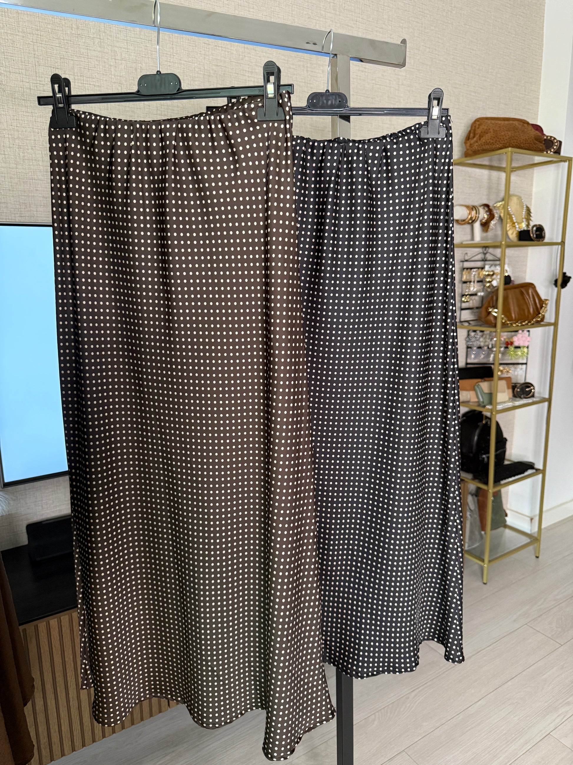 Disponible en dos colores sofisticados: marrón con lunares claros y negro con lunares blancos. Perfecta para combinar con camisas, tops o jerséis, y crear looks versátiles de día y de noche.