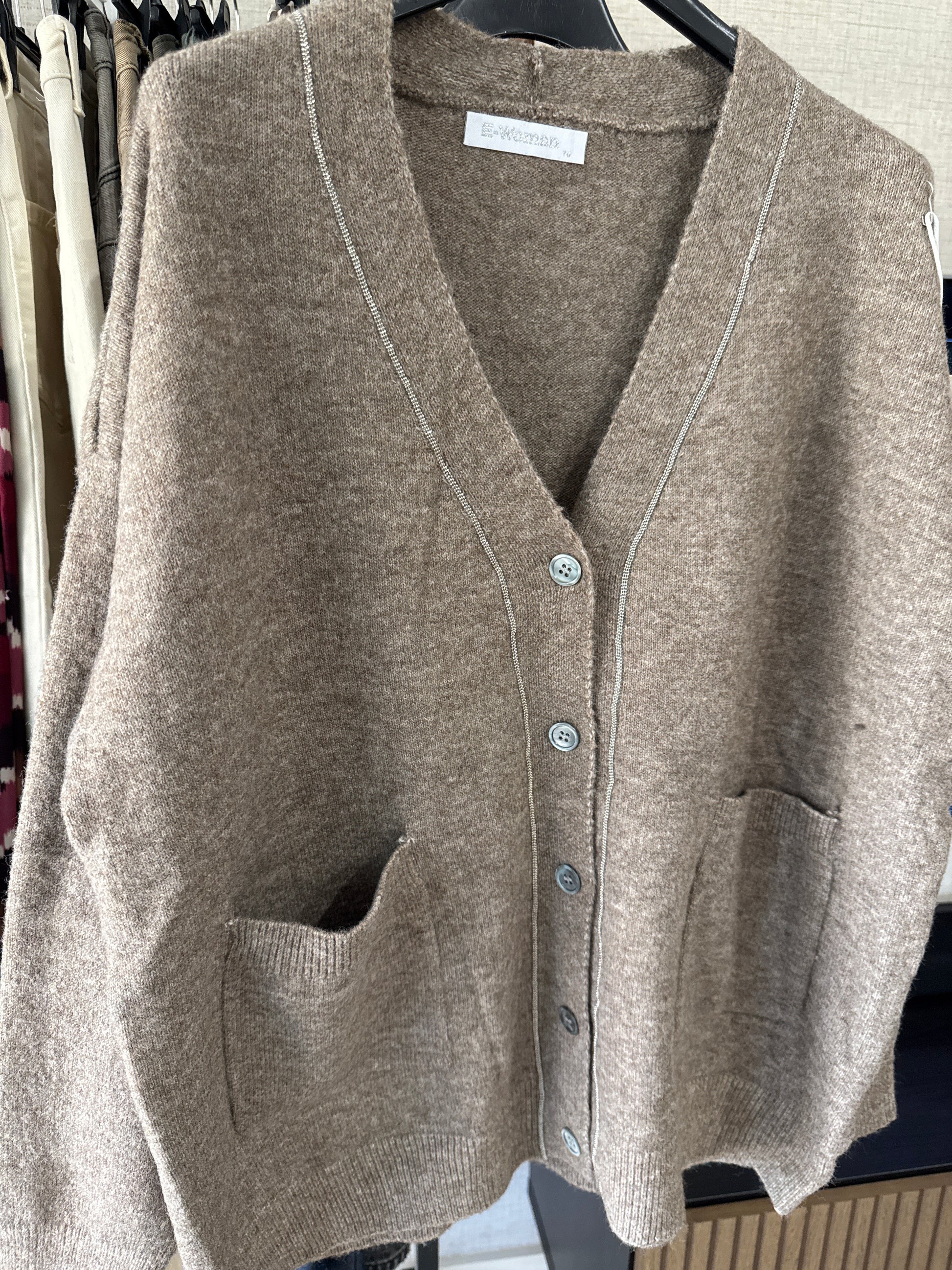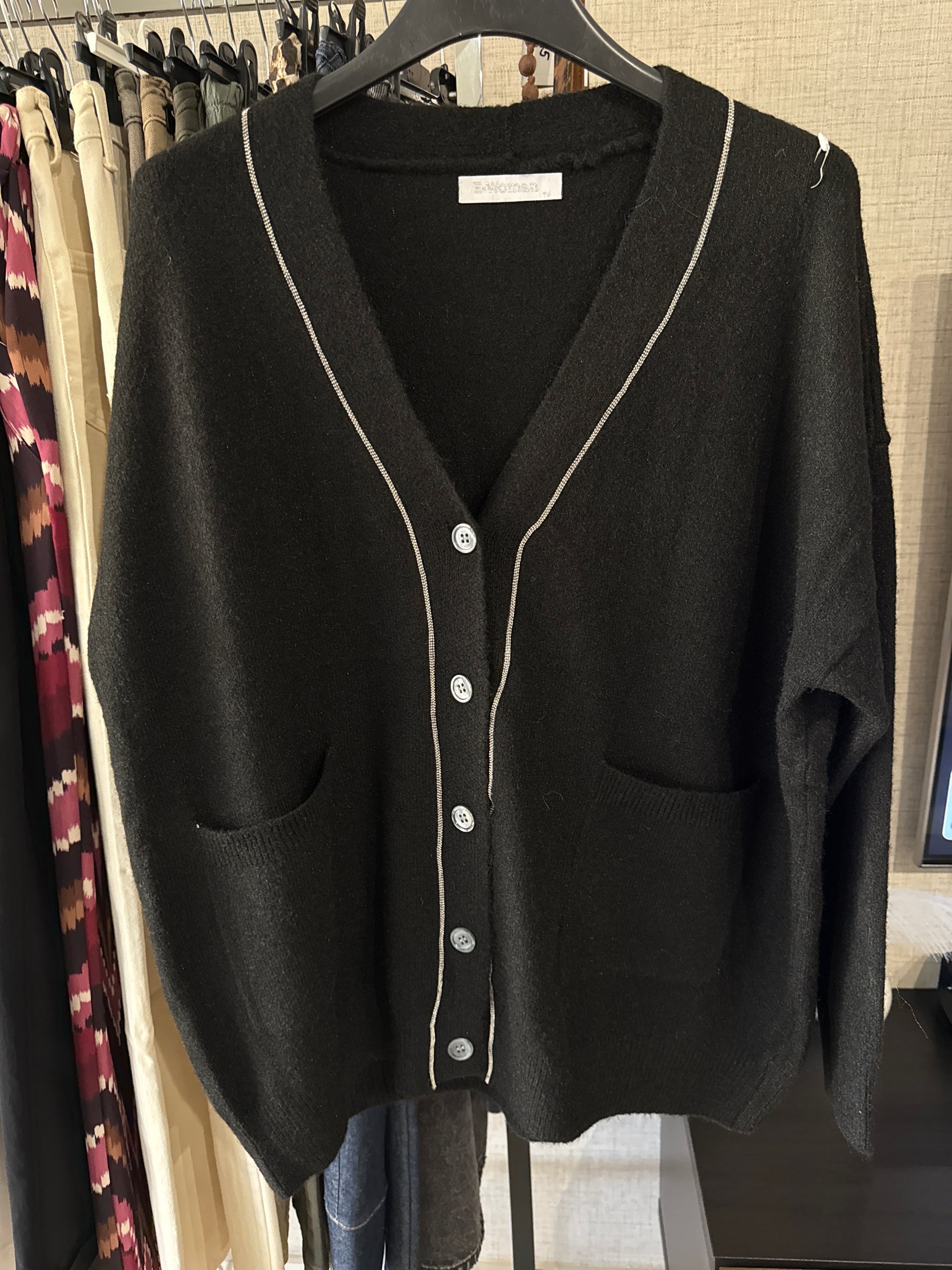 Jersey oversize de lana con bolsillos delanteros y cierre de botones, decorado con diminutas perlitas plateadas desde el escote hasta el bajo. Un diseño que combina comodidad y estilo, ideal para looks casuales o para aportar un toque chic a tus outfits de invierno.