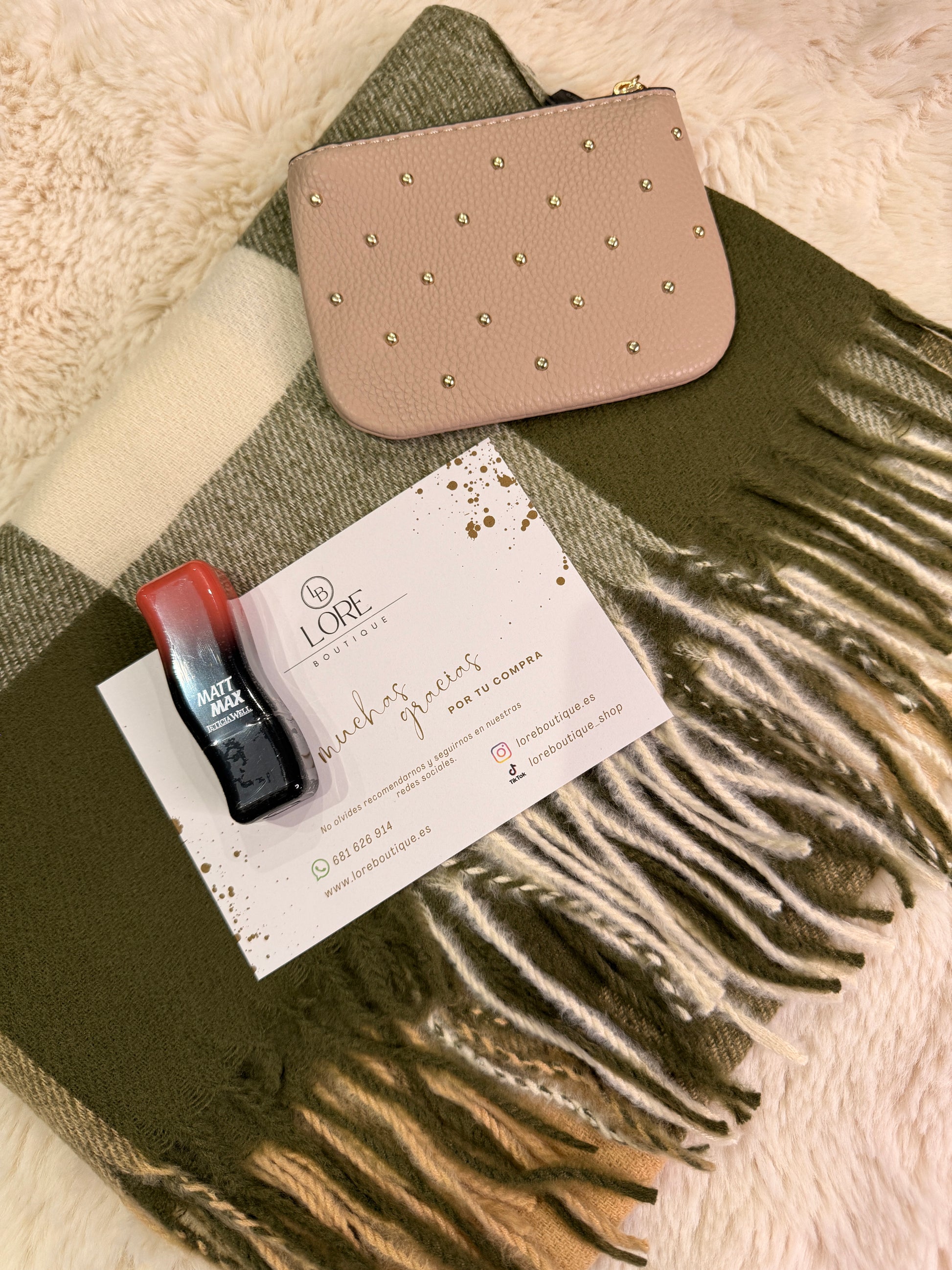 Un conjunto elegante y práctico que encantará: una bufanda de cuadros super suave efecto cashmere con flecos, ideal para combinar con cualquier look, y una carterita con tachuelas de diseño moderno y cremallera de alta calidad, perfecta para llevar lo esencial con estilo. ¡Un regalo que nunca falla! 🎁