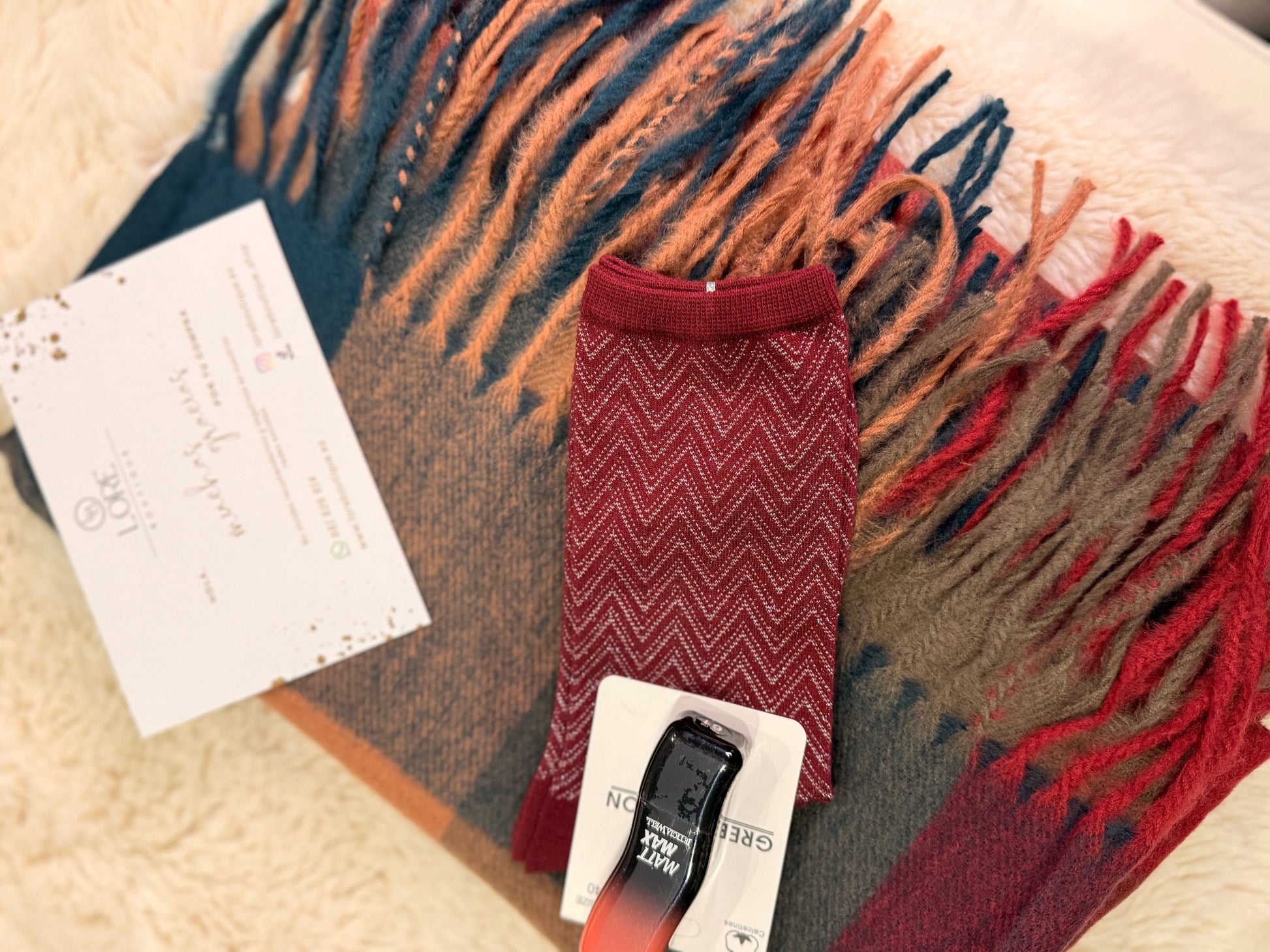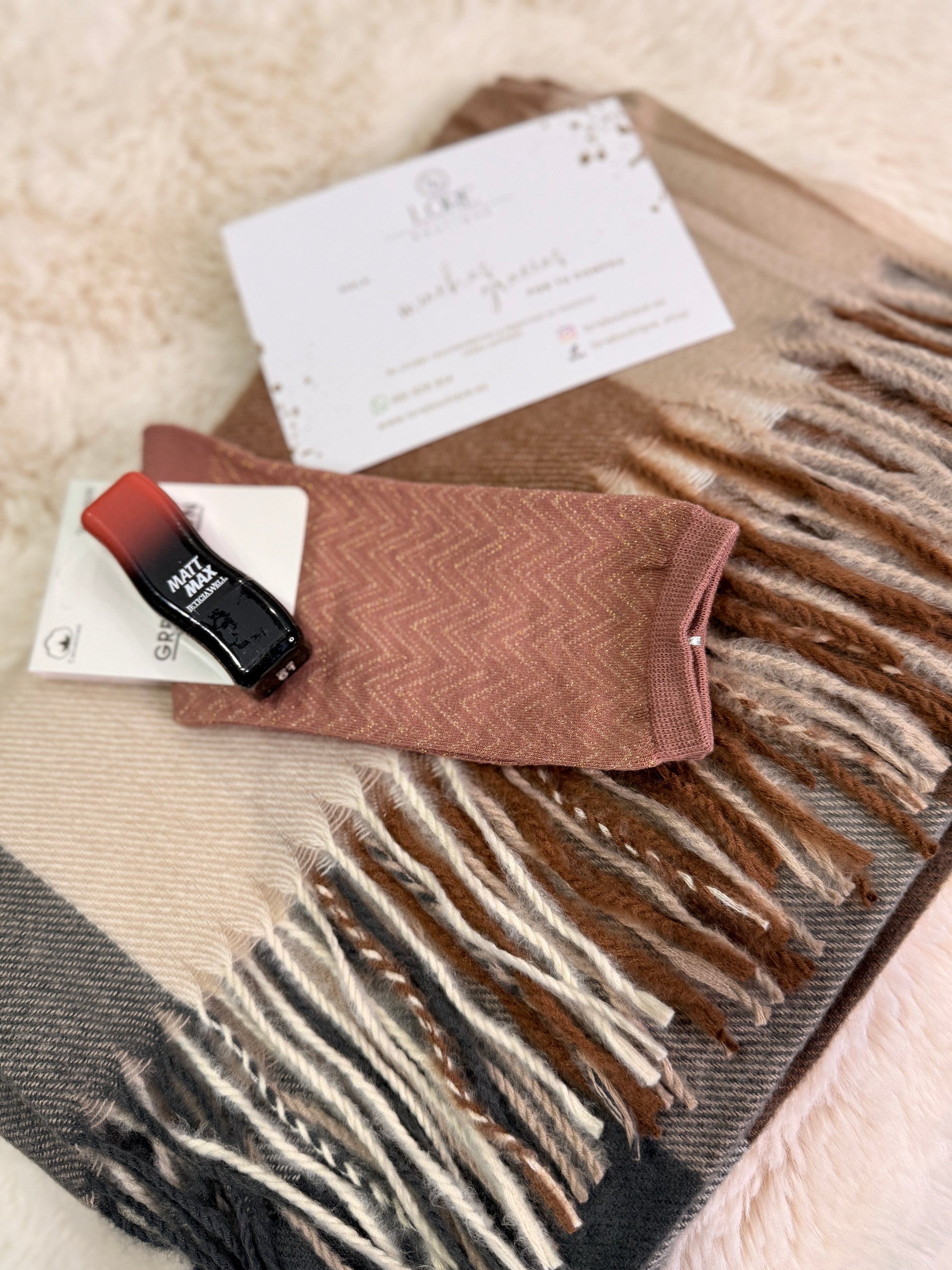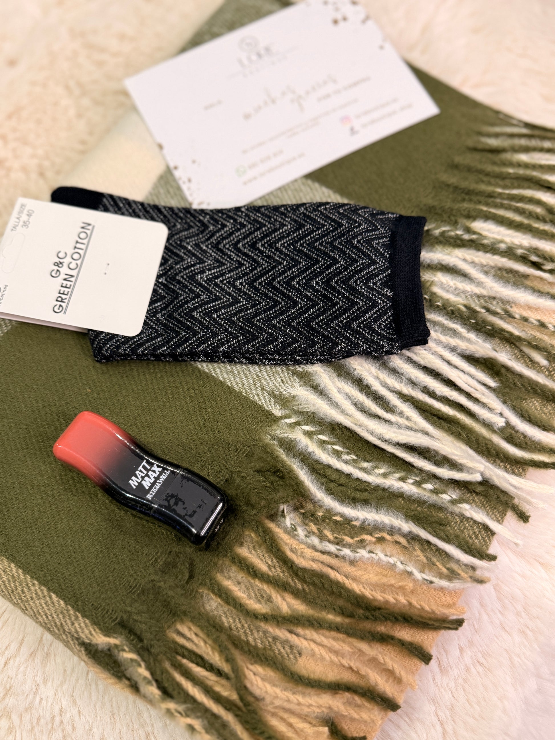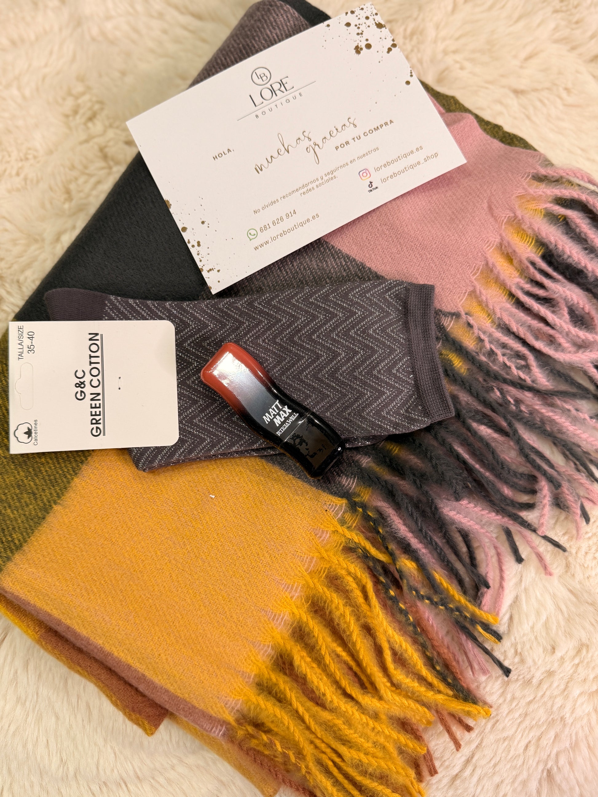 Un pack ideal para regalar sin complicarte. Incluye una bufanda super suave efecto cashmere, unos calcetines con brillo perfectos para estas fiestas y un pintalabios que completa el detalle. Bonito, práctico y perfecto para amiga invisible, profesoras o regalito rápido.