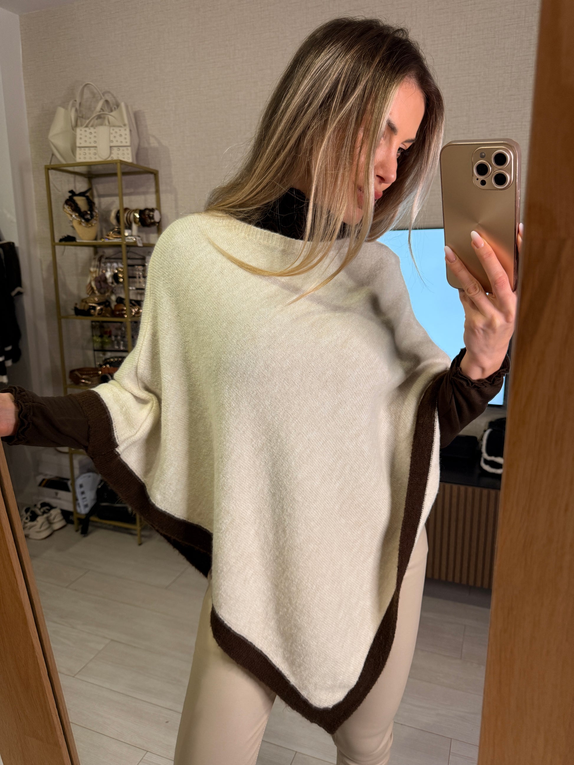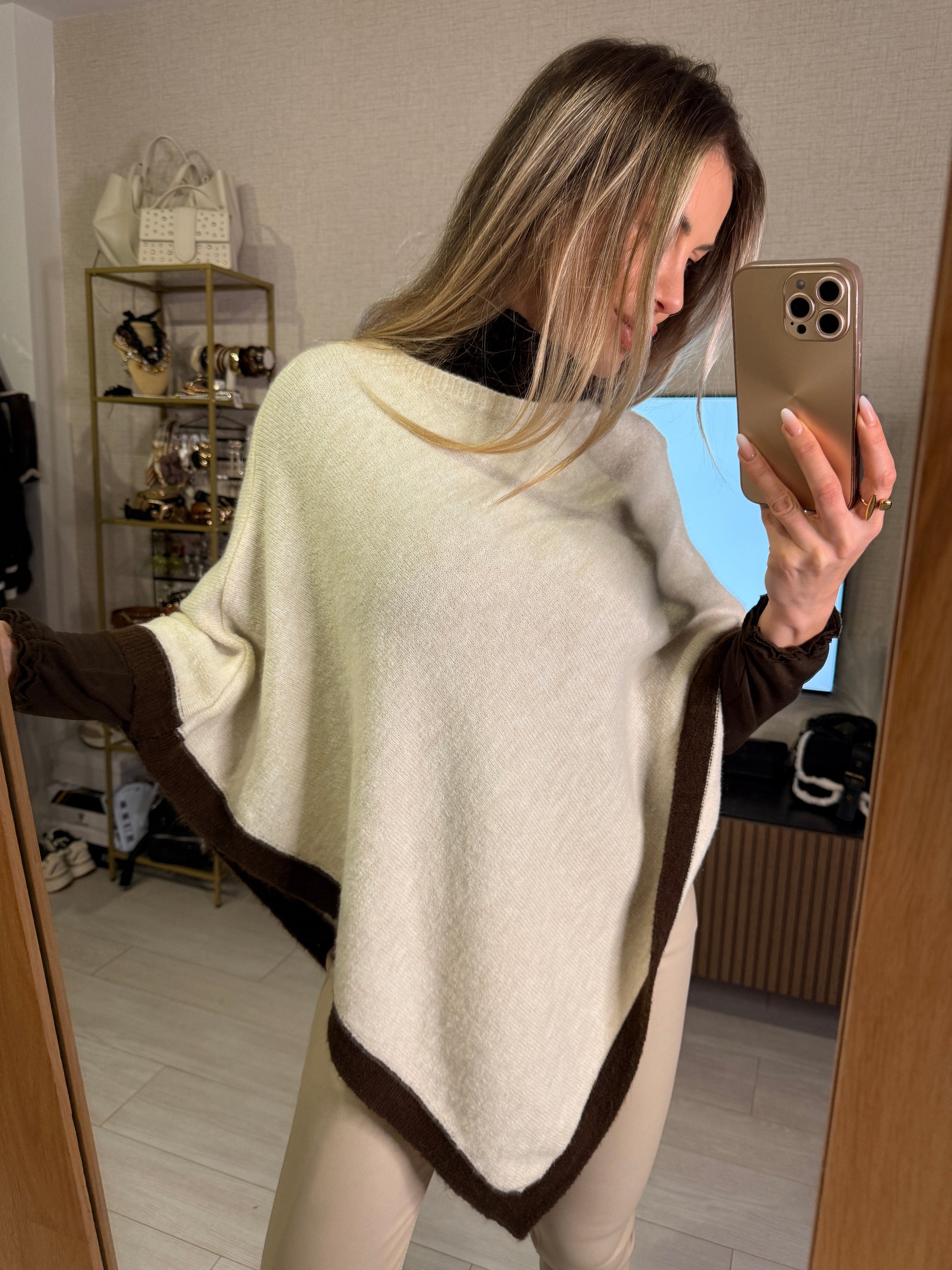 Súper abrigada y elegante, en color crudo con los bordes en marrón chocolate, que combina con vestidos, pantalones beige o marrones. Una prenda versátil que aporta estilo y sofisticación a cualquier look.