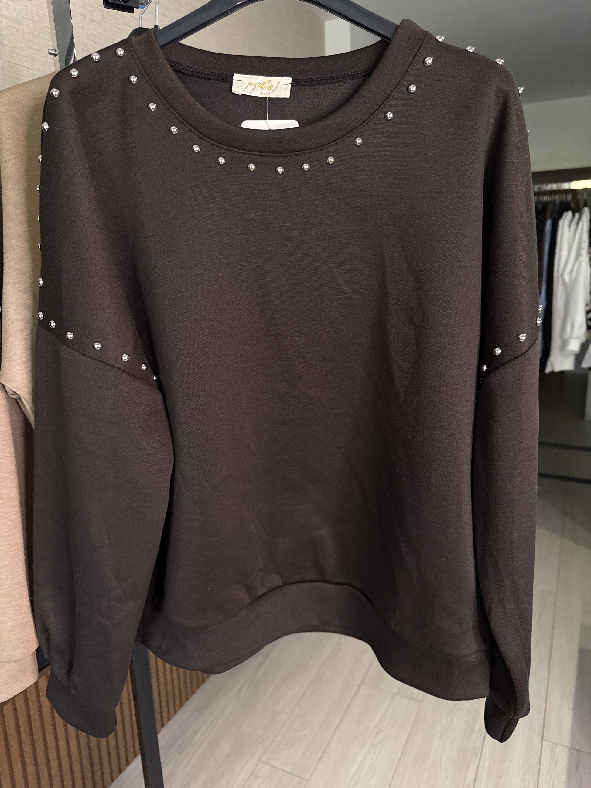 Sudadera de diseño sencillo con detalles de tachuelas que aportan personalidad a un básico cómodo. Disponible en tres colores: negro, marrón chocolate y taupe, perfecta para combinar con jeans, pantalones de cuero o faldas para un look casual con estilo.